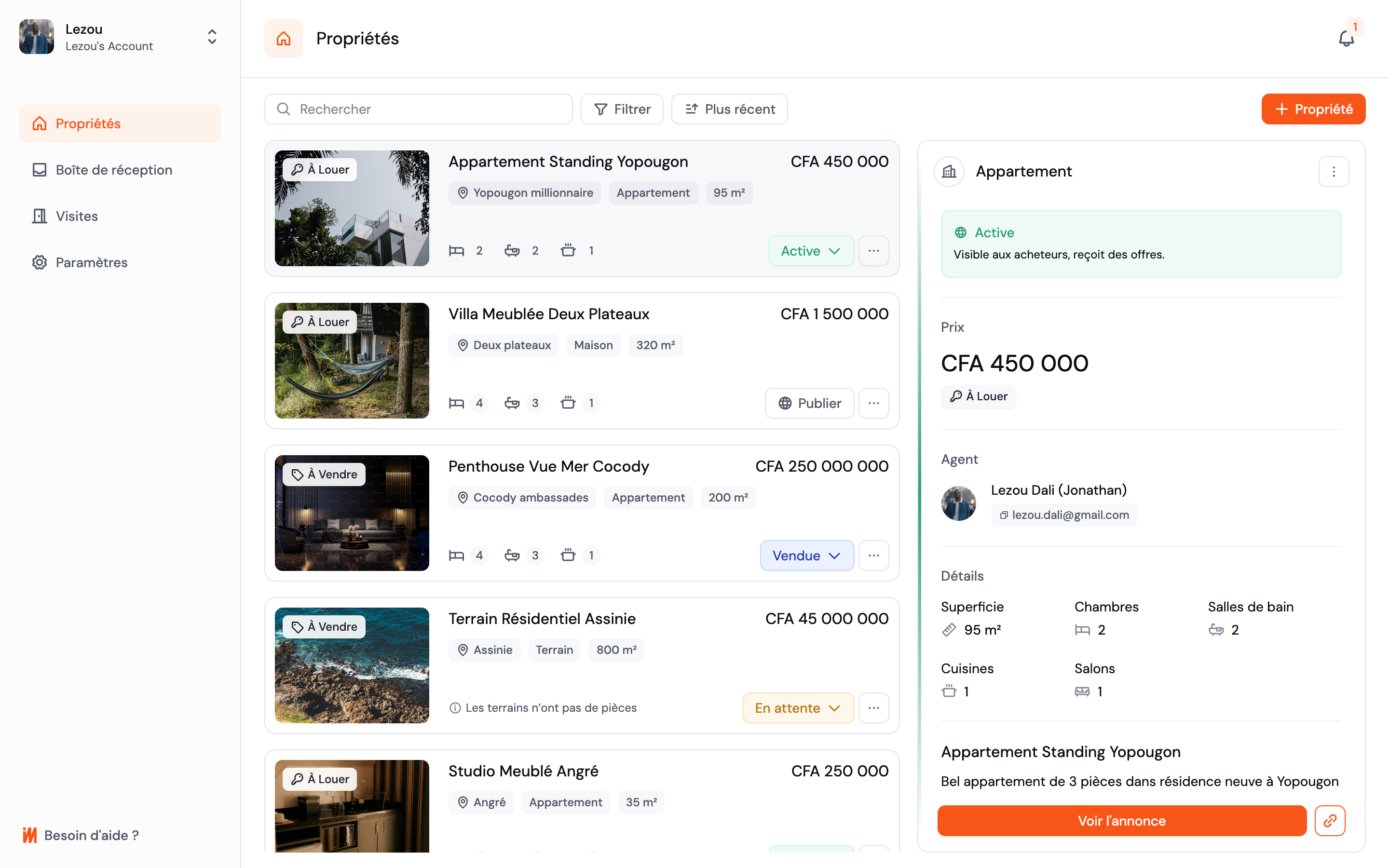 Publiez vos biens en quelques clics, recevez les demandes dans une inbox centralisée et organisez vos visites — depuis une seule plateforme.